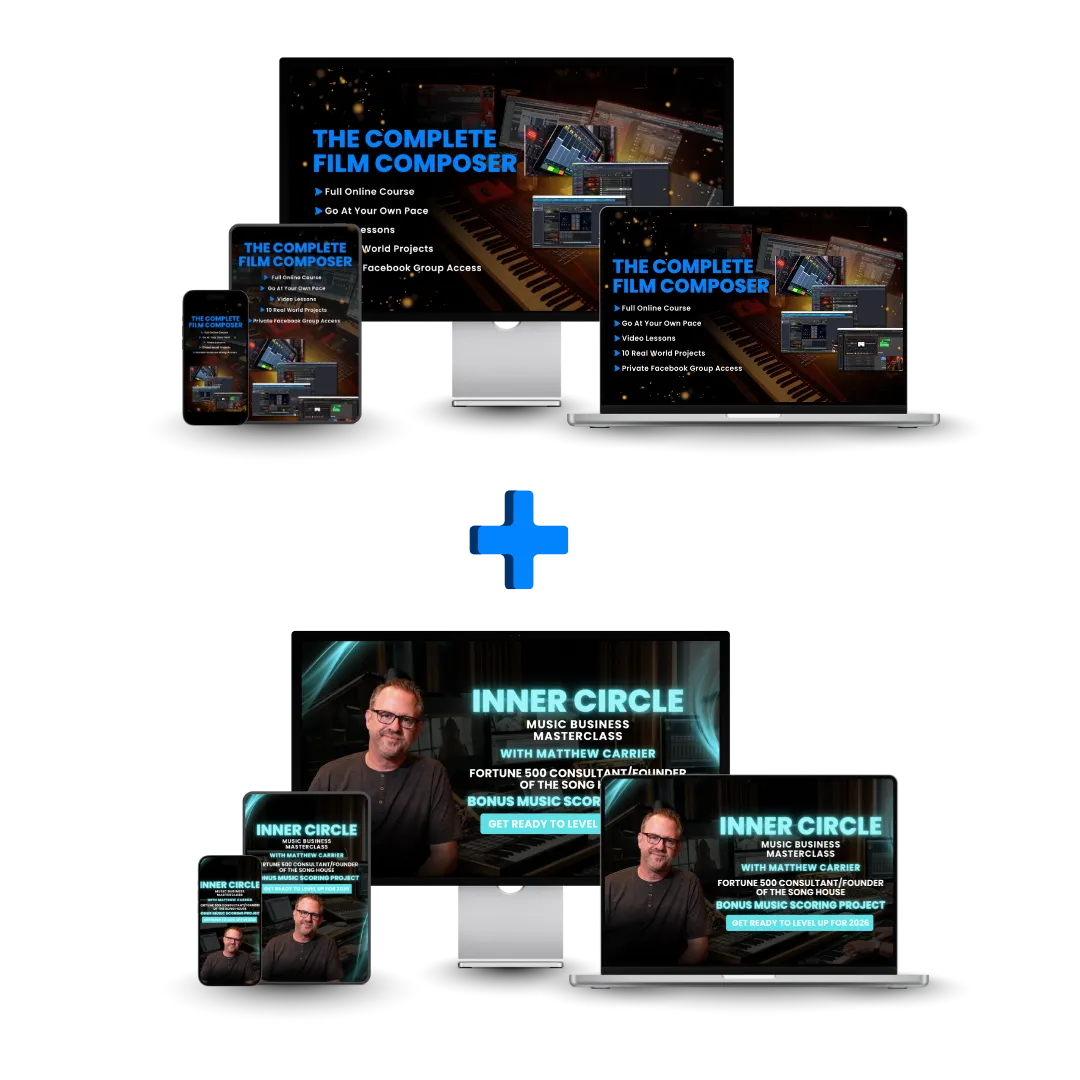 Film Composer Course (Self-Paced): You’ll receive full access to the Film Composer Course, a pre-recorded, on-demand training program that teaches the fundamentals of film scoring at your own pace.